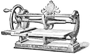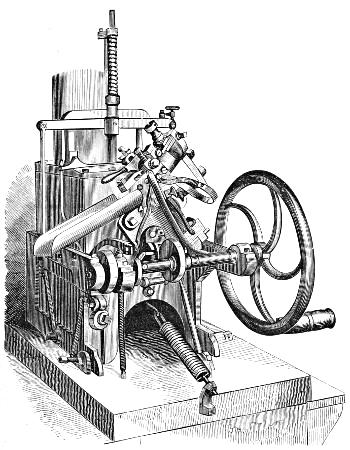Matthew Smith, a man of uncommon ability and business talents, died in 1842. The business was then continued by Richard M. Hoe, with his two brothers, Robert Hoe and Peter Smith Hoe,—the eldest, as before, taking charge of the mechanical department, in which his industry and fertility of invention are attested by the number and value of his patents. In 1837, he patented here and in England his method of grinding circular saws, by which the thickness of any part of a saw can be regulated with accuracy. In 1846, he brought out the so-called “Lightning Press,” or Type-Revolving Printing Machine, described in the text,—the greatest innovation on the routine of the printing craft since the days of Gutenberg. This press entirely superseded all others for fast printing, and was introduced into the principal offices, not only in this country, but in England, Scotland, Ireland, and Australia.