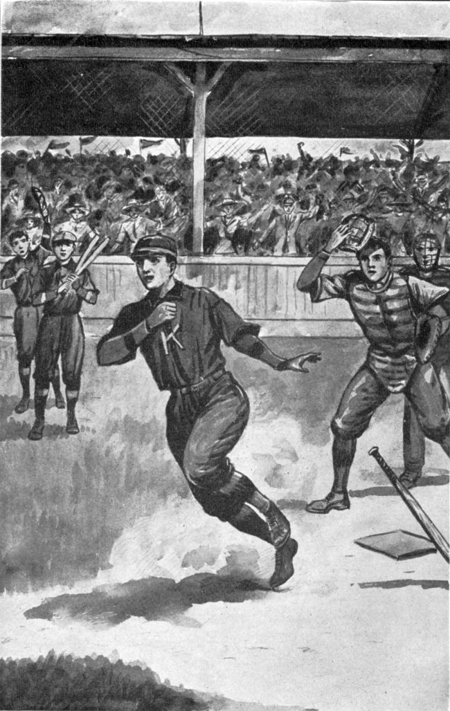 It was an audacious move and altogether unexpected by Arnold. A cry from the catcher, however, warned him, and in an instant he had picked up the ball and hurled it to the home plate. There seemed to be no chance for Percy, but when he was within twelve feet of the base he threw himself headlong and slid into the home plate amidst a cloud of dust. It seemed almost the same instant that the catcher caught the ball and touched Percy.