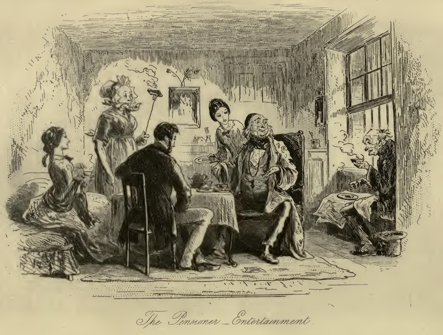 Flora tried in vain to soothe the excellent woman by explaining that they were going home to dinner. Mr F.‘s Aunt persisted in replying, ‘Bring him for’ard and I’ll chuck him out o’ winder!’ Having reiterated this demand an immense number of times, with a sustained glare of defiance at Little Dorrit, Mr F.‘s Aunt folded her arms, and sat down in the corner of the pie-shop parlour; steadfastly refusing to budge until such time as ‘he’ should have been ‘brought for’ard,’ and the chucking portion of his destiny accomplished.