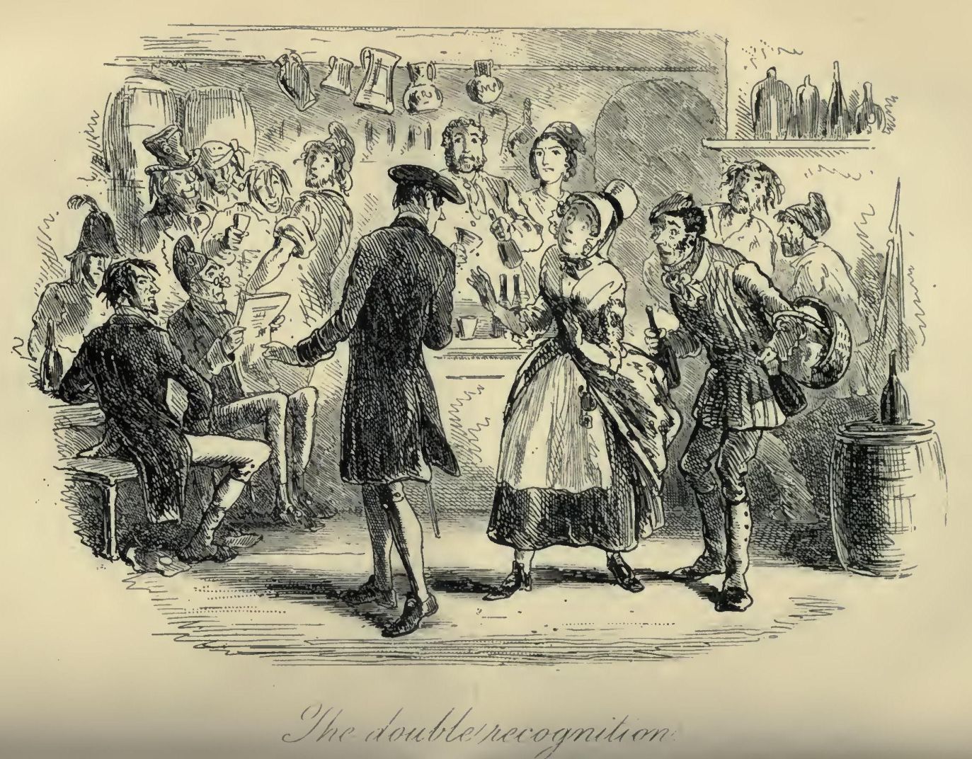 But the man continuing to exclaim, “Down, Evrémonde!” the face of Evrémonde is for a moment turned towards him. Evrémonde then sees the Spy, and looks attentively at him, and goes his way.